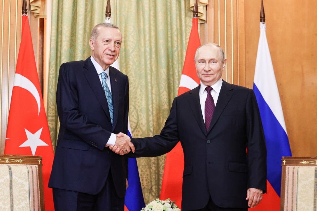 9月4日,在俄羅斯索契,俄羅斯總統(tǒng)普京(右)與土耳其總統(tǒng)埃爾多安握手。新華社/塔斯社