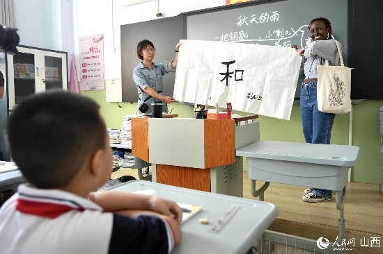 圖為莉迪亞給午亭小學(xué)三年級(jí)一班的同學(xué)贈(zèng)送書法禮物。人民網(wǎng) 盧鵬宇攝