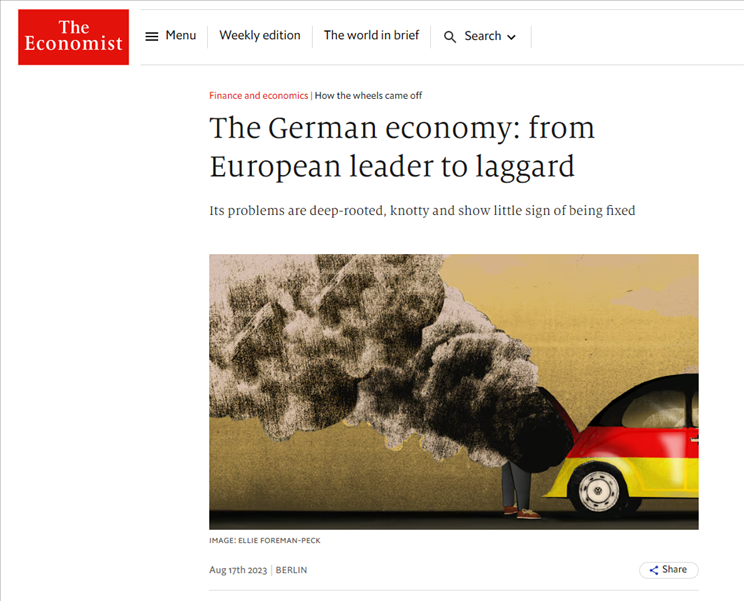 導(dǎo)致德國深陷沉疴的原因主要是高通脹、高利率和外部市場需求不振。高通脹造成企業(yè)生產(chǎn)成本增加和居民消費(fèi)減少,高利率則壓制了投資和借貸,外部市場需求減少直接打擊了德國的進(jìn)出口貿(mào)易。這三大病因看起來都是來自德國以外的壓力,但德國人自己在面對壓力時(shí)卻顯得束手無策。