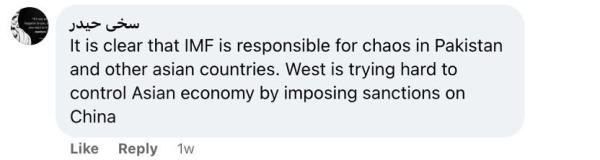 還有網(wǎng)友留言說(shuō):“國(guó)際貨幣基金組織對(duì)巴基斯坦和其他亞洲國(guó)家的混亂負(fù)有責(zé)任,這一點(diǎn)再清楚不過(guò)了。西方試圖通過(guò)制裁中國(guó)來(lái)控制亞洲經(jīng)濟(jì)。”