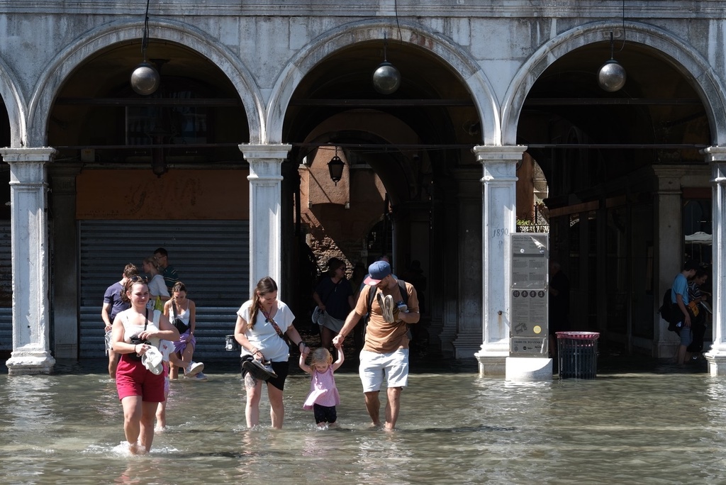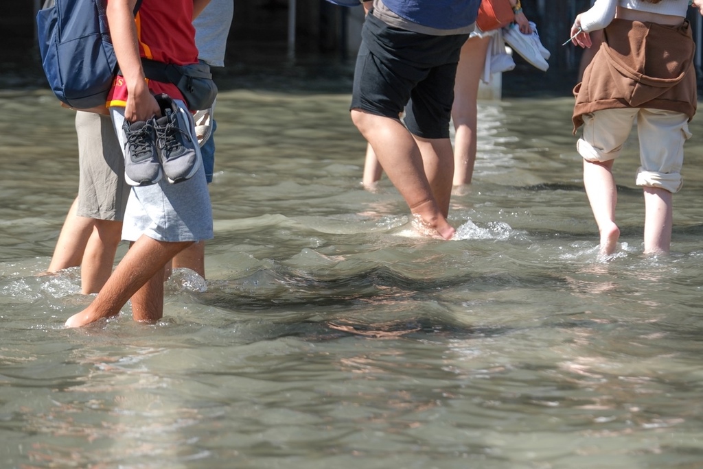 當(dāng)?shù)貢r間2023年8月6日,意大利威尼斯,游客走在積水的道路上。
