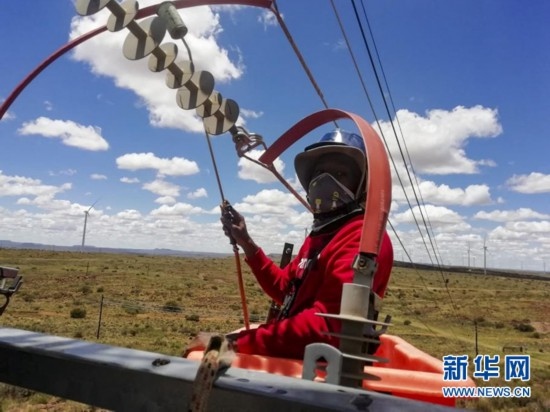 這是8月10日在南非北開普省德阿鎮(zhèn)拍攝的龍源南非公司德阿風電項目風機和輸電線路。 新華社記者 董江輝 攝