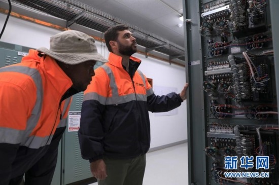 8月10日,在南非北開普省德阿鎮(zhèn),當地居民、變電站工作人員達斯溫·巴松(左)與變電站副主管雷加特·范滕德在龍源南非公司德阿風電項目變電站工作。新華社記者 董江輝 攝