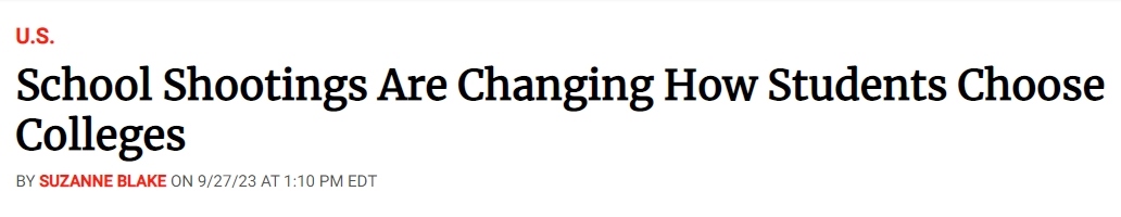 也是由于校園槍擊事件的日漸頻繁,美國學(xué)生選擇大學(xué)的方式也隨之發(fā)生變化。據(jù)美國《新聞周刊》(News Week)網(wǎng)站27日報道,僅在2023年,全美就發(fā)生了53起校園槍擊事件。“槍支暴力檔案”(Gun Violence Archive)的數(shù)據(jù)顯示,各類與槍支有關(guān)的死亡總共有3萬多起。