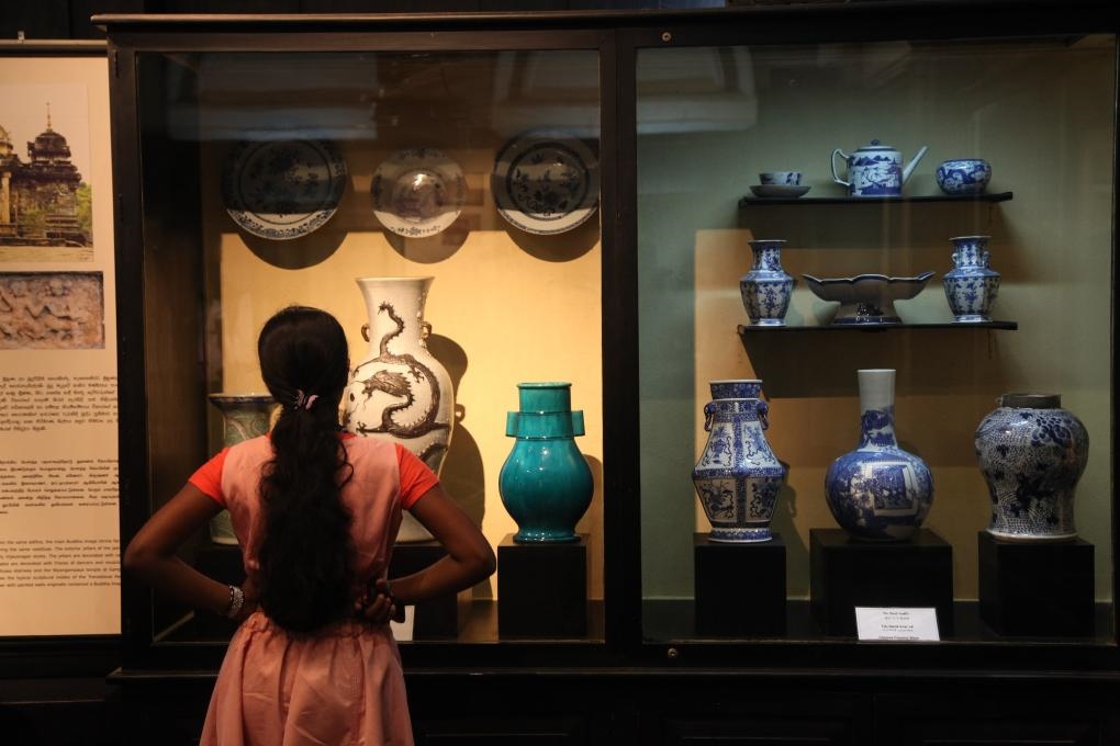 2014年9月15日,在斯里蘭卡首都科倫坡,游客參觀斯里蘭卡國(guó)家博物館展出的當(dāng)?shù)爻鐾恋闹袊?guó)古代瓷器,一些中國(guó)外銷瓷器上還繪有南亞、伊斯蘭風(fēng)情,與鄭和碑共同見證著古代海上絲綢之路和中斯友好交往的源遠(yuǎn)流長(zhǎng)。 新華社記者馮武勇攝
