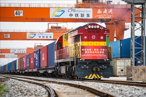 2022年4月22日,陜西西安首趟中老鐵路(西安至萬(wàn)象)國(guó)際貨運(yùn)列車從西安國(guó)際港站發(fā)車。新華社記者 劉翔 攝
