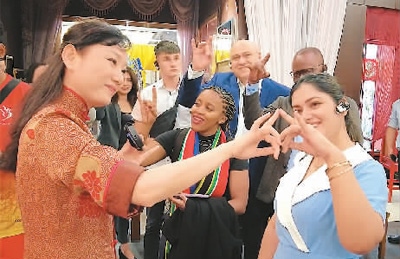 代表團(tuán)成員在古北市民中心昆曲教室學(xué)習(xí)昆曲手勢(shì)。