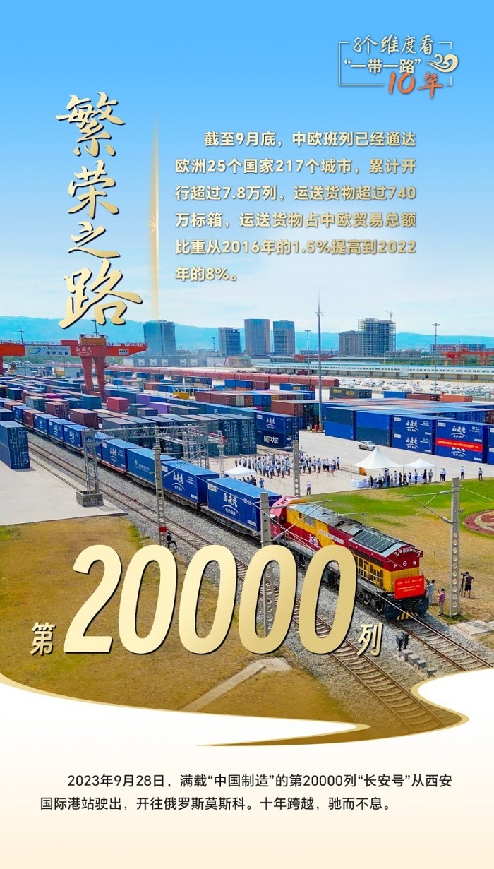 第20000列“長(zhǎng)安號(hào)”從西安國(guó)際港站駛出,給世界送去“中國(guó)制造”;中老鐵路突破重山阻隔,成為國(guó)際物流的“黃金通道”;蒙內(nèi)鐵路聯(lián)通東西,是東非鐵路網(wǎng)的開端,更是一條充滿希望的經(jīng)濟(jì)走廊……一個(gè)個(gè)合作豐碑,搭建起高效的貿(mào)易通道網(wǎng)絡(luò)平臺(tái),助力各國(guó)走好走穩(wěn)“一帶一路”這條繁榮之路。