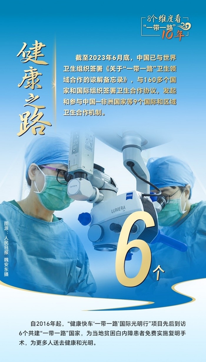 截至2023年6月底,中國(guó)已與世界衛(wèi)生組織簽署《關(guān)于“一帶一路”衛(wèi)生領(lǐng)域合作的諒解備忘錄》,與160多個(gè)國(guó)家和國(guó)際組織簽署衛(wèi)生合作協(xié)議,發(fā)起和參與中國(guó)—非洲國(guó)家、中國(guó)—阿拉伯國(guó)家、中國(guó)—東盟衛(wèi)生合作等9個(gè)國(guó)際和區(qū)域衛(wèi)生合作機(jī)制。為共建國(guó)家培養(yǎng)數(shù)萬(wàn)名衛(wèi)生管理、公共衛(wèi)生、醫(yī)學(xué)科研等專業(yè)人才,向58個(gè)國(guó)家派出中國(guó)醫(yī)療隊(duì),赴30多個(gè)國(guó)家開展“光明行”,免費(fèi)治療白內(nèi)障患者近萬(wàn)名,與湄公河流域國(guó)家、中亞國(guó)家、蒙古國(guó)等周邊國(guó)家開展跨境醫(yī)療合作,衛(wèi)生健康合作成效顯著。
