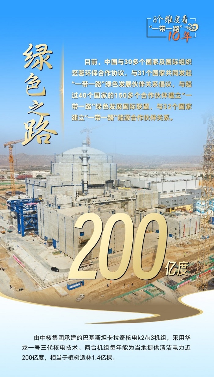 十年來(lái),“綠色絲綢之路”建設(shè)取得豐碩成果。中國(guó)已與30多個(gè)國(guó)家及國(guó)際組織簽署環(huán)保合作協(xié)議,與31個(gè)國(guó)家共同發(fā)起“一帶一路”綠色發(fā)展伙伴關(guān)系倡議,與32個(gè)國(guó)家建立“一帶一路”能源合作伙伴關(guān)系。