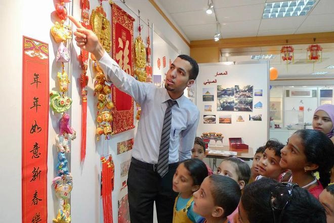 一位埃及青年正認(rèn)真向圍在身邊的學(xué)生們講解中國(guó)傳統(tǒng)文化中的十二生肖。他身穿白色襯衫,系著條紋領(lǐng)帶,學(xué)生們仰起頭,專心致志地聆聽(tīng)講解。這位埃及青年便是時(shí)年28歲的阿巴斯。作為開(kāi)羅中國(guó)文化中心主任助理,他經(jīng)常在這里向埃及學(xué)生和民眾介紹中國(guó)的文房四寶和京劇臉譜,講解中國(guó)的傳統(tǒng)節(jié)日和風(fēng)景名勝,并帶領(lǐng)孩子們做手工,燈籠、風(fēng)箏和寫(xiě)對(duì)聯(lián)往往是他們最喜愛(ài)的內(nèi)容。在當(dāng)年埃及的動(dòng)蕩時(shí)局下,中國(guó)文化中心照常對(duì)外開(kāi)放,各種活動(dòng)有序開(kāi)展。首屆大使杯“魅力埃及,多彩中國(guó)”攝影大賽作品展就吸引了上百名開(kāi)羅市民前往參觀。