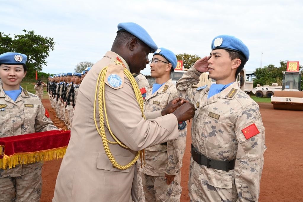 2023年10月28日,在聯(lián)合國(guó)駐南蘇丹特派團(tuán)瓦烏超級(jí)營(yíng)地的中國(guó)工兵營(yíng)區(qū),聯(lián)南蘇團(tuán)西戰(zhàn)區(qū)司令哈根(中)在授勛儀式現(xiàn)場(chǎng)授予中國(guó)維和官兵聯(lián)合國(guó)“和平榮譽(yù)勛章”。新華社發(fā)(李飛宇攝)