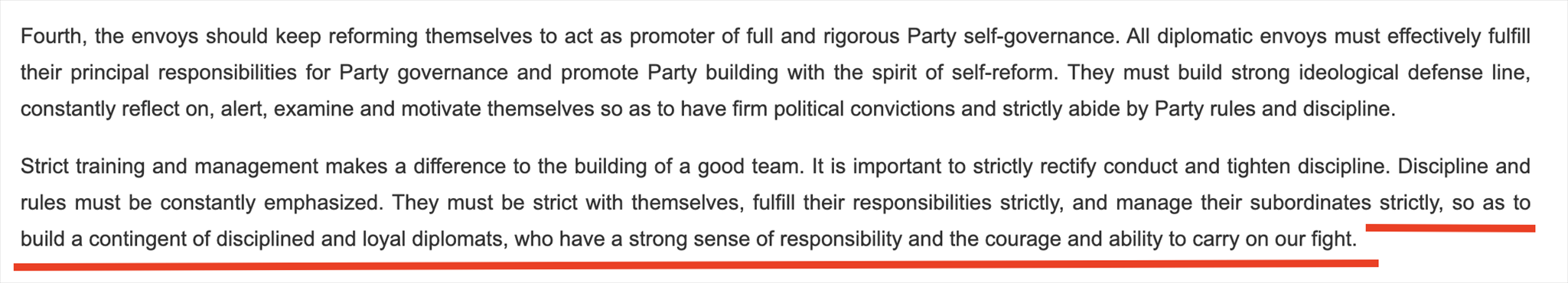 “鐵軍”一詞常見于政府文件或領導人講話,更多的是強調(diào)工作作風和紀律。在近年來中國領導人講話中,曾多次出現(xiàn)“紀律監(jiān)察鐵軍”“生態(tài)環(huán)境保護鐵軍”等表述。中國領導人在接見與會使節(jié)時的講話中說:“打造一支對黨忠誠、勇于擔當、敢斗善斗、紀律嚴明的外交鐵軍?!蓖饨徊烤W(wǎng)站對這句話的英文翻譯(見下圖)同樣強調(diào)外交隊伍的紀律、責任和勇氣。作為通行做法,世界各國對本國外交人員都有著很高的紀律要求。
