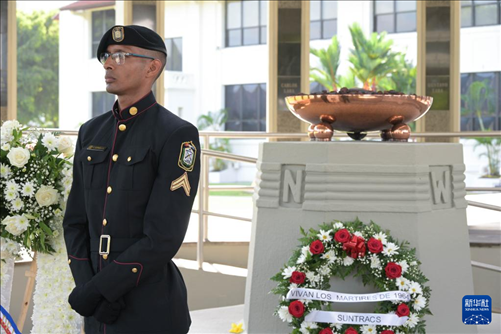 1月9日,在巴拿馬首都巴拿馬城,兩名士兵向紀(jì)念“護(hù)旗運(yùn)動(dòng)”的“永恒之火”紀(jì)念碑獻(xiàn)花圈。新華社記者 陳昊佺 攝