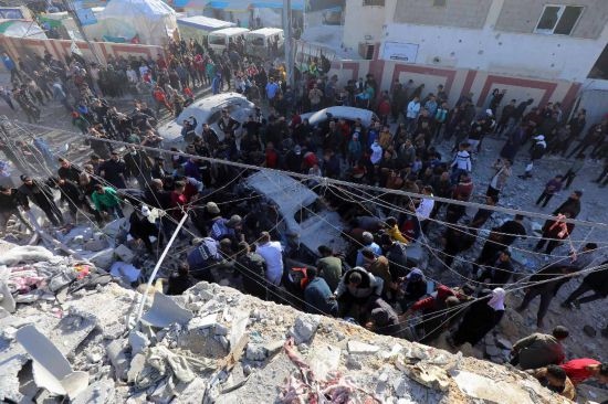 1月10日,在加沙地帶中部城市代爾拜拉赫,人們?cè)谝攒娍找u后開展救援。新華社發(fā)(巴勒斯坦通訊社供圖)