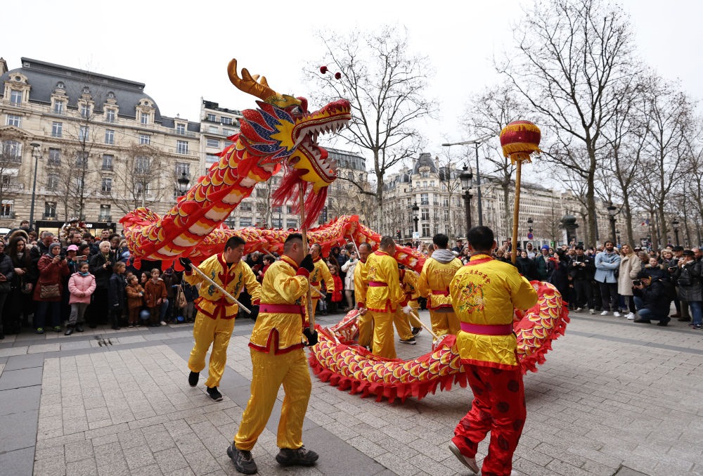 2月4日,人們?cè)诜▏?guó)巴黎香榭麗舍大街觀(guān)看舞龍舞獅表演。新華社記者 高靜 攝
