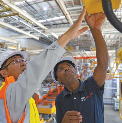 中國和南非兩國員工在南非東開普省北汽南非工廠焊裝車間內(nèi)工作。新華社記者 張譽(yù)東攝