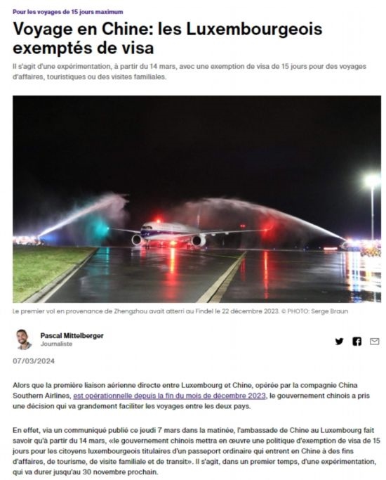 近日,中國政府決定自2024年3月14日0時起至2024年11月30日24時,對包括盧森堡在內(nèi)的6國持普通護(hù)照人員實行部分免簽。中國駐盧使館及時向盧外交部等部門和主流媒體作了通報,盧政府和媒體對中方免簽政策予以高度評價。