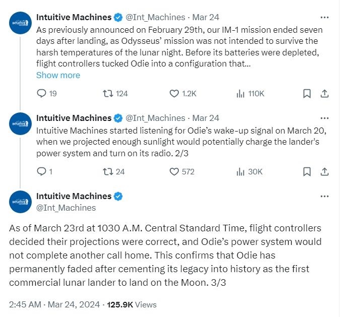 “經(jīng)過數(shù)天等待,已確認‘奧德修斯’電力系統(tǒng)已不能支持它再次完成通信,”聲明寫道。“這證實‘奧德修斯’作為首個由私營企業(yè)發(fā)射的月球著陸器永久休眠?!?/p>