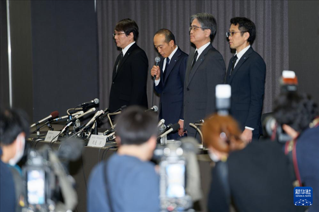 3月29日,小林制藥公司社長小林章浩(左二)及相關負責人在日本大阪舉行的新聞發(fā)布會上鞠躬。新華社記者 張笑宇 攝