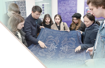2024年3月20日,在江蘇南通市崇川區(qū)“文化崇川 游我所愛”中外文化交流活動(dòng)中,來(lái)自俄羅斯、巴基斯坦、印度尼西亞、盧旺達(dá)等國(guó)家的學(xué)生現(xiàn)場(chǎng)了解藍(lán)印花布印染技藝。許叢軍攝(人民視覺)