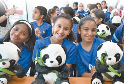 2023年9月17日,在科威特哈瓦利省的科威特中國(guó)文化中心,學(xué)習(xí)漢語(yǔ)的孩子們與熊貓玩具合影。阿薩德攝(新華社發(fā))
