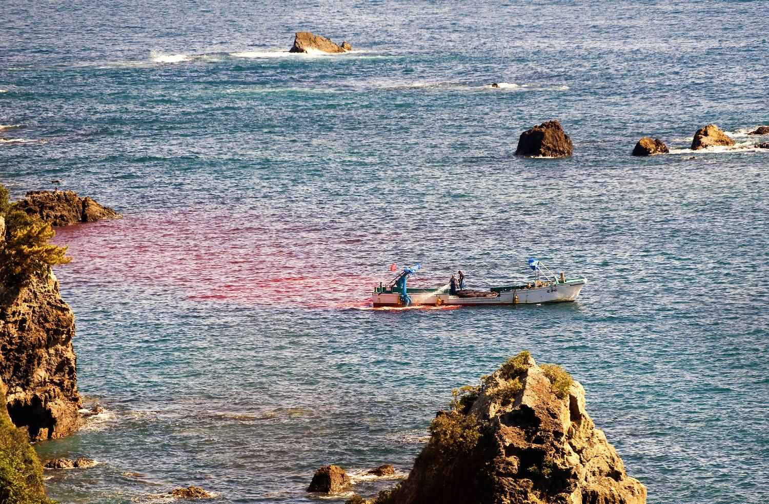 2009年,大量野捕海豚在太地町被屠殺,鮮血染紅海面。圖片來源:Robert Gilhooly
