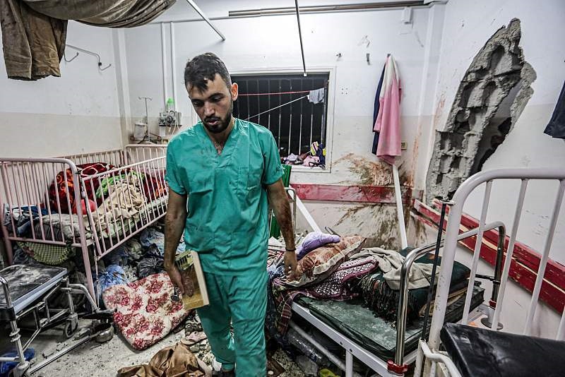 △2023年12月,納賽爾醫(yī)院遭以軍轟炸后,一名男子在查看病房。