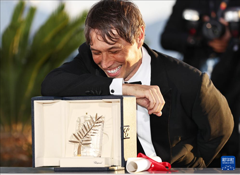 5月25日,在法國南部城市戛納舉行的第77屆戛納電影節(jié)上,美國導(dǎo)演肖恩·貝克與“金棕櫚獎”獎杯合影留念。新華社記者 高靜 攝