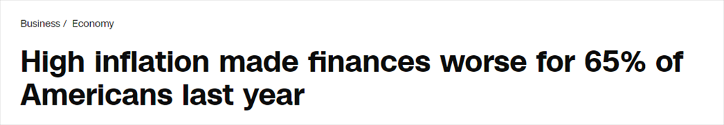 美聯(lián)儲近日發(fā)布的《2023年美國家庭經(jīng)濟狀況報告》(Economic Well-Being of US Households)顯示,65%的美國家庭的財務(wù)狀況因通脹而惡化,其中19%的人認為財務(wù)狀況“嚴(yán)重惡化”。