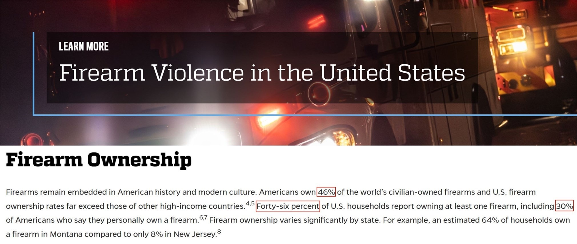 約翰斯·霍普金斯大學(xué)槍支暴力解決方案中心2023年發(fā)布的數(shù)據(jù)顯示,世界上近一半(46%)的民用槍支在美國(guó);近一半(46%)的美國(guó)家庭報(bào)告擁有至少一把槍,其中30%的人承認(rèn)自己擁有槍支。