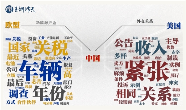 可以看到,以“車輛”“部門”“公司”“制造”等詞為代表的關鍵詞,都指向了新能源行業(yè)。相比之下,美國媒體對同一話題的討論,更側(cè)重“緊張”“關系”“沖突”“政治”等指向外交關系的關鍵詞。