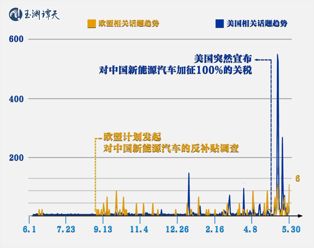 譚主分地區(qū)集納了過去一年外媒關于“對中國新能源汽車加征關稅”的報道,發(fā)現(xiàn)美國和歐洲地區(qū)出現(xiàn)了明顯的錯峰: