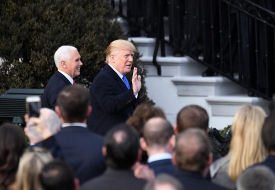2017年12月20日,在美國(guó)華盛頓白宮,時(shí)任美國(guó)總統(tǒng)特朗普(右)和副總統(tǒng)彭斯準(zhǔn)備就國(guó)會(huì)通過稅改法案發(fā)表講話。新華社記者殷博古攝