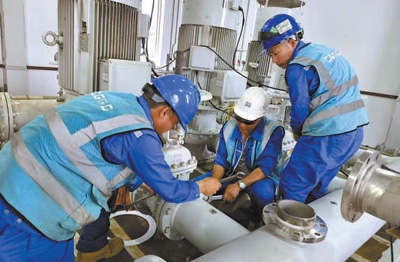 工作人員正在對(duì)阿聯(lián)酋烏姆蓋萬(wàn)海水淡化設(shè)備管道系統(tǒng)進(jìn)行維護(hù)。盧偉寧攝