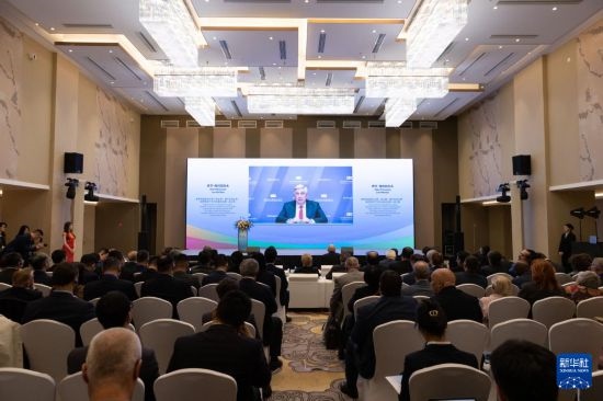 9月23日,在俄羅斯首都莫斯科,俄羅斯國家杜馬第一副主席、俄中友好協(xié)會(huì)主席伊萬·梅利尼科夫在論壇上發(fā)表視頻講話。新華社記者 白雪騏 攝