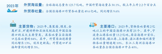 在全球范圍內(nèi),超八成的國際貿(mào)易通過海上運(yùn)輸實現(xiàn),海運(yùn)是中國外貿(mào)的“大動脈”?!吨袊劭谶\(yùn)行分析報告(2024)》(以下簡稱《報告》)顯示,2023年,在外貿(mào)需求回暖、全球貿(mào)易體系重塑等因素推動下,中國外貿(mào)海運(yùn)規(guī)模增長較快,全國沿海港口外貿(mào)吞吐量達(dá)49.6億噸,同比增長9.6%。