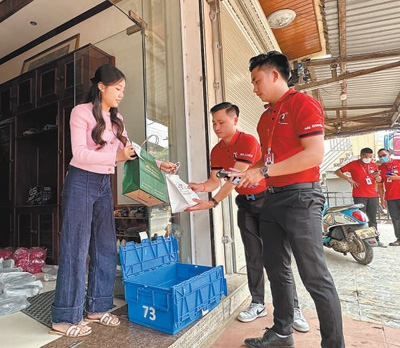中午時分,記者來到老撾首都萬象市塔鑾附近的一處便民服務(wù)點。摩托車來來往往,不時有當?shù)鼐用駚泶耸瞻l(fā)電商商品。工作人員正忙著將收到的商品掃描、稱重、歸類、打包,趕在傍晚送到轉(zhuǎn)運中心發(fā)往目的地。