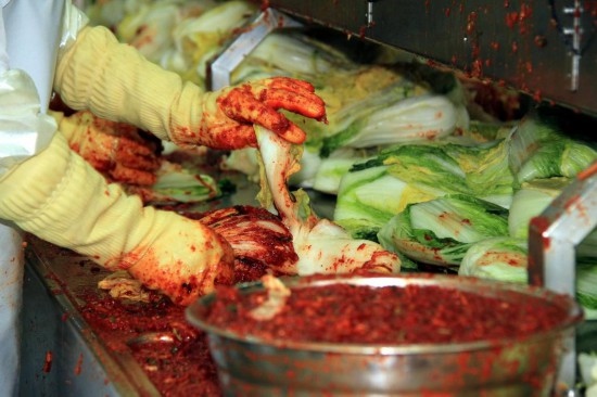 2011年12月8日,在韓國(guó)慶尚南道居昌郡韓國(guó)著名泡菜公司“宗家府”的工廠(chǎng)內(nèi),工人們將調(diào)制好的配料抹到整棵的大白菜上。新華社記者何璐璐攝