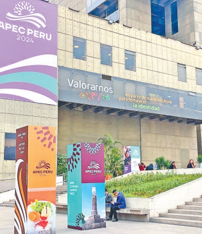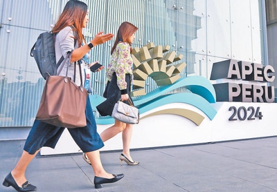 人們從2024年亞太經(jīng)合組織會(huì)議標(biāo)識(shí)前走過。瑪麗安娜·巴索攝(新華社發(fā))