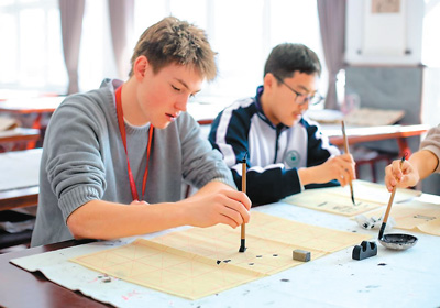 圖為活動(dòng)期間,來(lái)自美國(guó)得克薩斯州圣史蒂芬圣公會(huì)學(xué)校的學(xué)生查爾斯·錢(qián)寧·達(dá)根(左)在河北衡水中學(xué)學(xué)習(xí)書(shū)法。