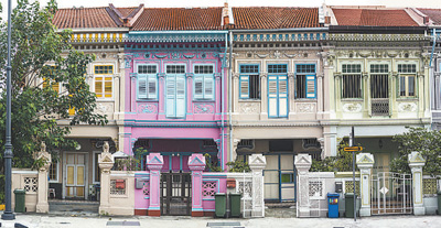 初至新加坡,我用腳步丈量這個(gè)國(guó)家,每一步都仿佛踩在歷史與現(xiàn)實(shí)的交匯點(diǎn)上。行至加?xùn)|街區(qū)的如切路,仿佛走進(jìn)時(shí)光的萬(wàn)花筒,瞬間被頗具歷史感的娘惹建筑環(huán)繞。街道兩旁,色彩斑斕的娘惹排屋(見(jiàn)圖,約翰·西頓·卡拉漢攝,影像中國(guó))如同一幅幅鋪開(kāi)的絢麗油畫(huà):中式飛檐與歐式廊柱巧妙融為一體;門(mén)窗上的雕花精致細(xì)膩,盡顯龍鳳等中國(guó)圖案的吉祥寓意、棕櫚紋等馬來(lái)元素的自然之美和歐洲巴洛克風(fēng)格的華麗細(xì)節(jié);彩色玻璃在陽(yáng)光下折射出五彩斑斕的光澤;繁復(fù)的花卉瓷磚如華麗織錦,讓人目不暇接……一步一景,皆散發(fā)著濃郁的南洋風(fēng)情,好似輕吟淺唱一曲悠遠(yuǎn)的歲月之歌。