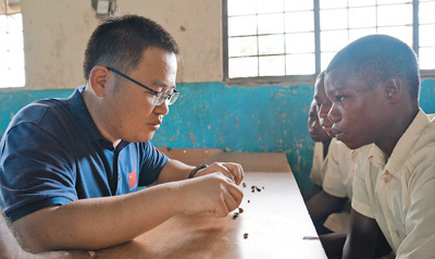 中國(guó)專家向姆坦噶尼小學(xué)學(xué)生講解血吸蟲(chóng)病防治知識(shí)。