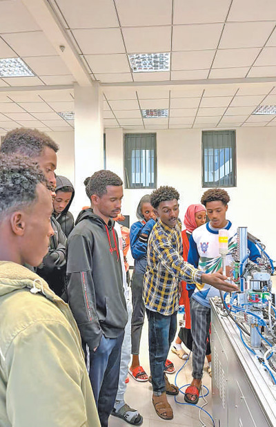 埃塞俄比亞魯班工坊當(dāng)?shù)亟處煘閷W(xué)生們講解機(jī)電一體化設(shè)備的操作方法。
