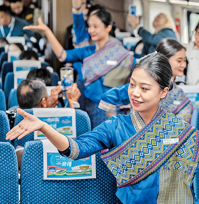 1月14日,中國(guó)鐵路昆明局集團(tuán)有限公司“金花列車員”在D87次中老鐵路國(guó)際旅客列車上表演節(jié)目。