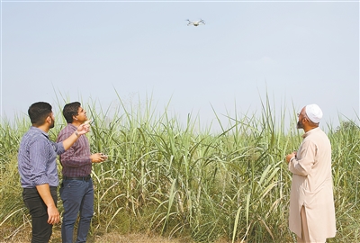 中國—巴基斯坦人工智能智慧農(nóng)業(yè)實(shí)驗(yàn)室研發(fā)人員運(yùn)用無人機(jī)定期巡檢畫面,通過人工智能分析,實(shí)時向農(nóng)戶反饋?zhàn)魑锷L情況。