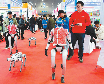 2025年3月14日,在2025中國義烏國際日用百貨創(chuàng)新博覽會上,智能機(jī)器人與現(xiàn)場人員互動。