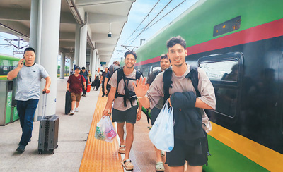 外國旅客乘坐中老鐵路跨境旅客列車抵達云南磨憨站。