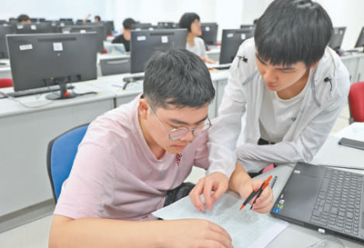 廈門大學(xué)馬來西亞分校能源與化工學(xué)院工程制圖課上,兩名學(xué)生在討論作業(yè)。