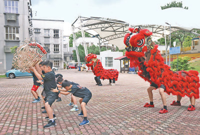 馬來西亞中小學(xué)生在馬來亞大學(xué)醒獅團(tuán)組織的培訓(xùn)課上練習(xí)舞獅。